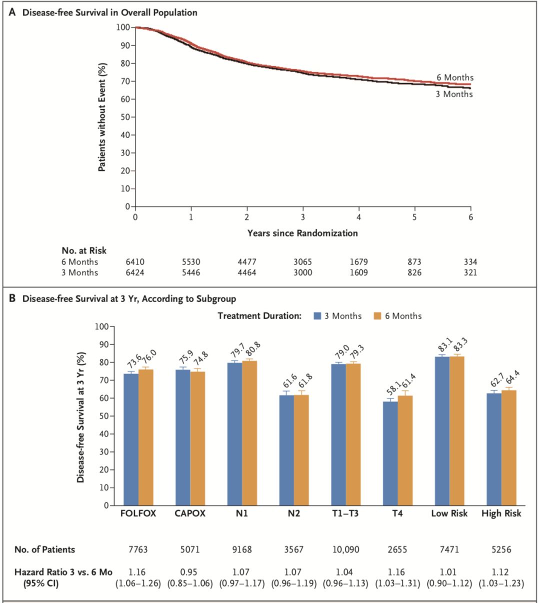 不过即使如此,两组之间的3年无病生存期(DFS)差距不大,3个月治疗组为74.6%,6个月治疗组为75.5%。