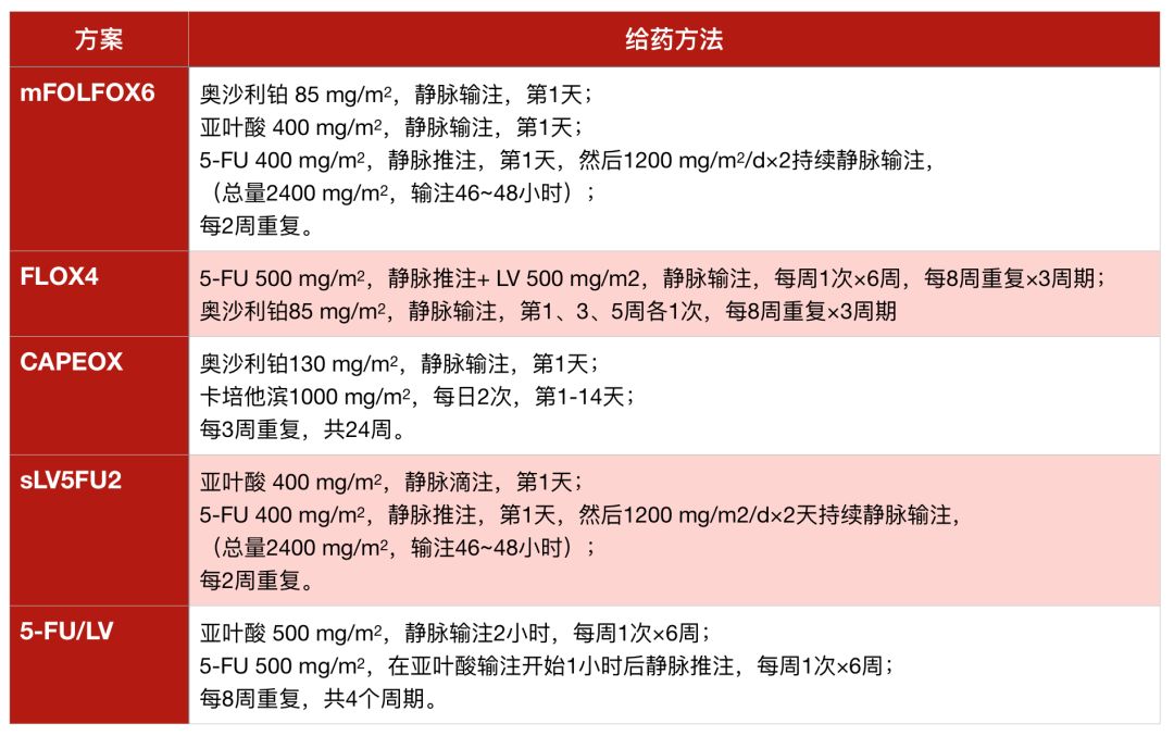目前,2018年3月14日更新的NCCN 结肠癌治疗指南2018 V2中推荐了mFOLFOX6、CAPEOX两种带有奥沙利铂的方案,但也保留了两种仅使用了氟尿嘧啶+亚叶酸的方案[12]。