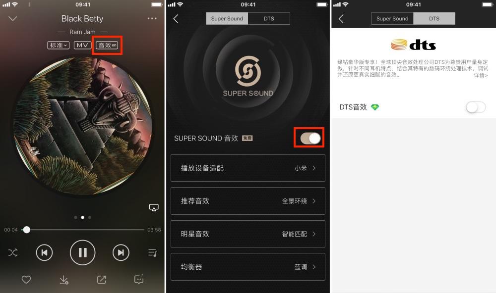 其实,另一款主流的音乐*放播**器也早就有了类似的功能。在 QQ 音乐里,用户可以直接点击*放播**界面的「音效」进入设置页面选择自己喜欢的音效。其中,Super Sound 为免费音效,而 DTS 音效为绿钻用户专享。