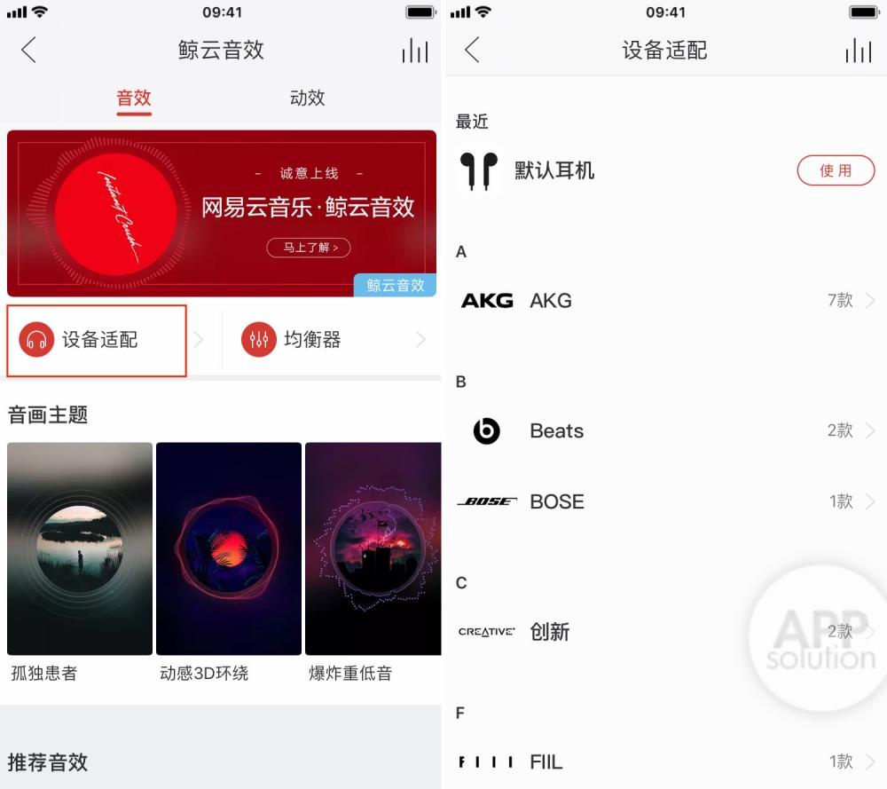 开启「鲸云音效」后,先「设备适配」。网易云音乐为了更好地适配用户的耳机,也针对 Beats、Bose、Sony 等品牌设备推出了 50 多款设备音效。用户可以在「设备适配」里找到自己的耳机型号,使用「专属」的音效。如果没有适配耳机的话,那么直接选择使用「默认耳机」体验非专属的音效就好了。