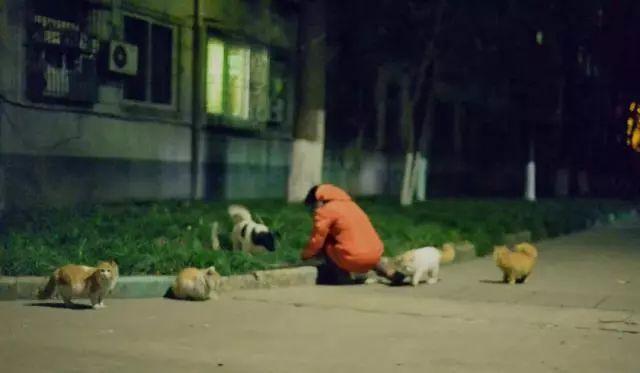 每到一处喂猫咪聚集点,张阿姨借着手电筒的光亮,喂满食、添好水,再用扫帚在地上一扫。流浪猫就会知道扫帚发出的哗哗声是开饭的号令,便齐刷刷的聚过来。