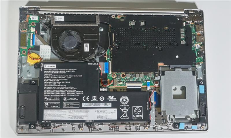 拆开笔记本底盖,可以看到其内部结构。主板关键区域有一块金属防护罩保护着。