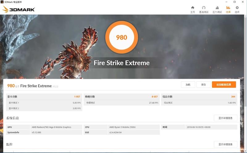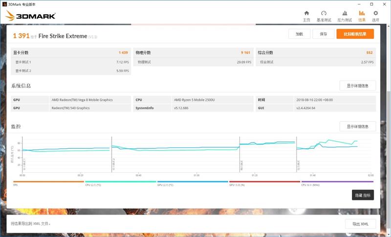 为了对比Vega 8与Radeon 540的性能差距,我们关闭独显用核显运行了一次3DMark测试。