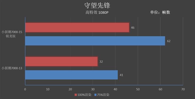 在100%渲染下,小新潮7000-15锐龙版测得平均帧数为46帧,基本上全程都很流畅。降到75%渲染时,大幅提高到了62帧,比小新潮7000-13要强50%。