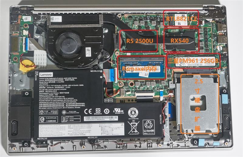被热管右端覆盖的是Radeon 540独立显卡,中间那个则是锐龙5 2500U处理器。