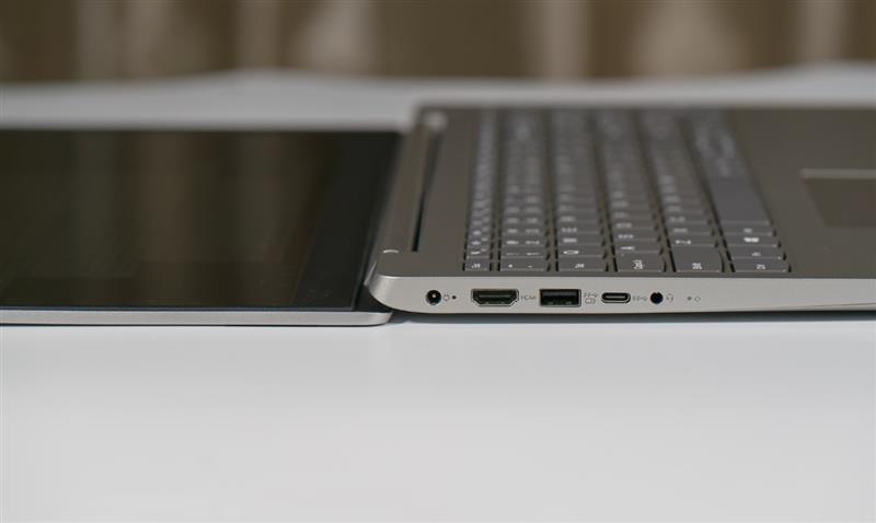 机身左侧从左往右依次是电源接口,HDMI、1xUSB3.0、1xType-C以及一个3.5mm的耳麦一体接口。