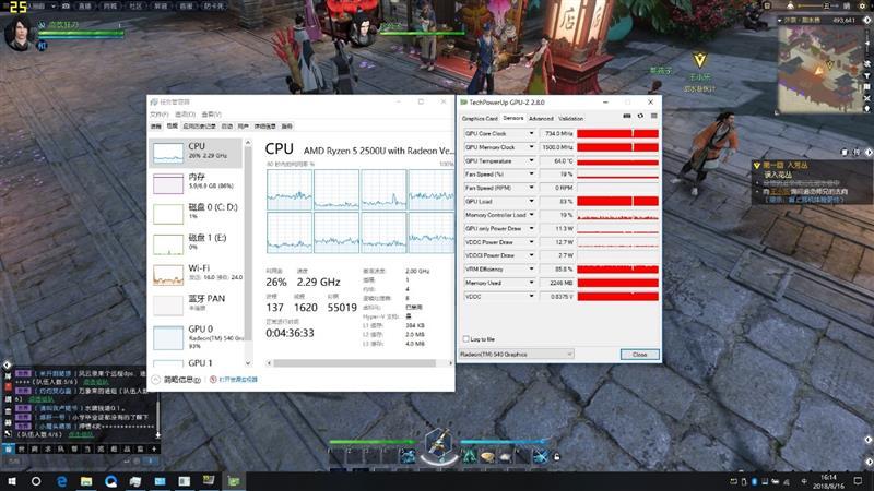 事实上,即便是规格参数相同,独立显卡有专用的显存,独享显存带宽,并且独立显卡不受处理器TDP约束,不需要与CPU核心去争抢锐龙5 2500U有限的25W TDP。基于这两点来分析,Radeon 540 游戏性能比锐龙自带的Vega 8强30%左右,后续测试也基于独立显卡。