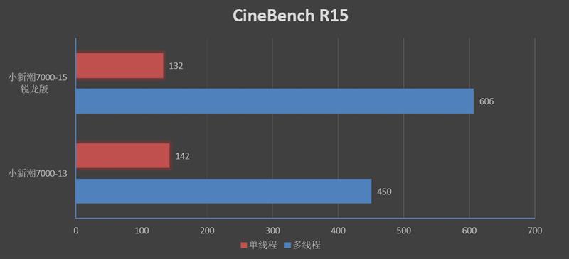 小新潮7000-15锐龙版在CineBench R15中单核分数为132cb,多线程成绩则为606cb。