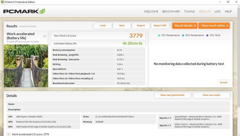 小新潮7000-15锐龙版内置了总容量52.5Wh的锂电池。官方宣称可以实现7.5小时的电池续航,我们用PCMark8来检验一下,测试时选择平衡电源管理模式、关闭所有其他进程,屏幕亮度调为50%。