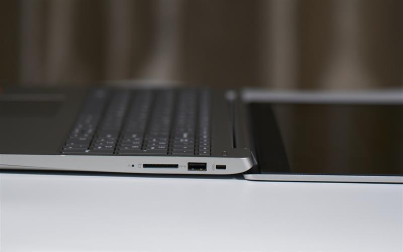 机身右有一个防盗锁孔、1xUSB3.0和一个SD读卡器接口,读卡器旁边有个小孔,是联想的一键恢复键位。