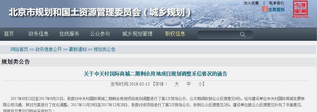 去年8月22日——9月21日,规划和国土资源对中关村国际商城二期剩余用地项目规划调整进行了第1次现场公示,经与建设单位中关村国际商城发展有限公司沟通,其对方案进行了优化调整。去年11月29日——12月28日,对该项目进行了第2次现场公示,对收到的一些意见予以采信。