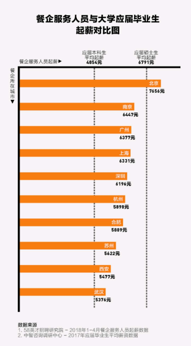 对比中智咨询调研中心去年9月发布的《2017届全国应届毕业生起薪水平调查报告》可发现,该薪资水平已普遍高于2017应届本科毕业生的平均起薪。而在北京,北京餐饮企业支付薪资水平甚至高出2017应届硕士毕业生的平均起薪近千元。广州的6377元平均薪资,也高出2017应届本科毕业生的平均起薪1500元左右。