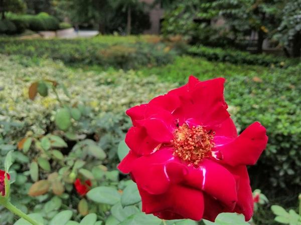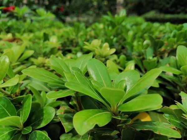 这是微距下的红色花朵与灌木树叶,可以看到华为麦芒7对于所摄图像倾向于高对比度、高色温的处理,其成像要比肉眼实际所见更加讨喜,另外可见其焦外的虚化处理拿捏较为适当。
