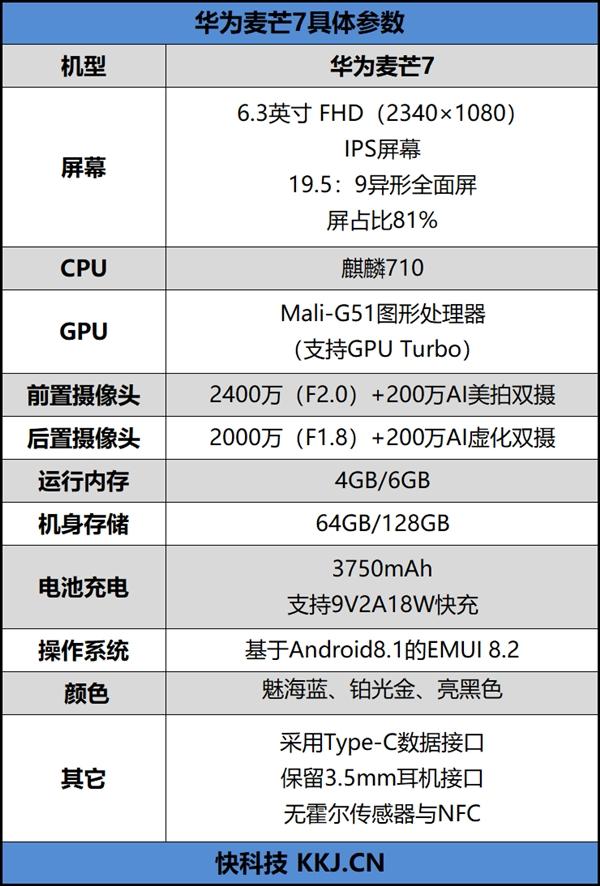 此外,华为麦芒7还搭载了华为自研的麒麟710准旗舰移动平台,搭配了6.3英寸19.5:9异形全面屏,容量达3750mAh的大电池辅以18W快充。