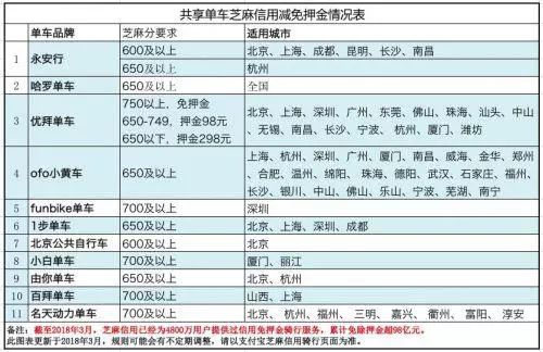 一是通过芝麻信用分,分数达到600及以上可以免押金,涉及企业包括ofo、哈罗、永安行等,不同企业有不同的信用分要求。这也是目前共享单车平台推行免押金主要运用的途径。
