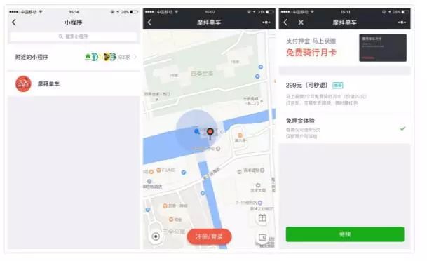 四是通过微信小程序,主要代表是摩拜。去年8月,摩拜宣布在全国150多个城市开展新用户免押金试骑活动,用户通过微信小程序注册摩拜账户即可参加,每周有5次免押金骑行机会。值得一提的是,这项免押金活动只针对新用户。