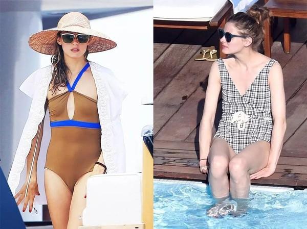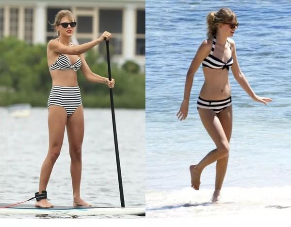 另外,无论你多保守都好,遮盖过多的平角款式都是不可取的。同样是黑白横条纹的花色,Taylor Swift多露了一点肌肤面积,身体线条就流畅了很多。