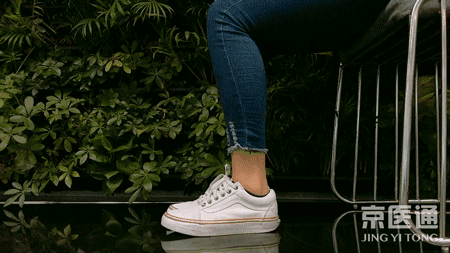 左腿自然弯曲,弯下腰用左手轻轻按摩小腿肚10至15次,换右脚依次重复。可有效促进腿肚血液循环。