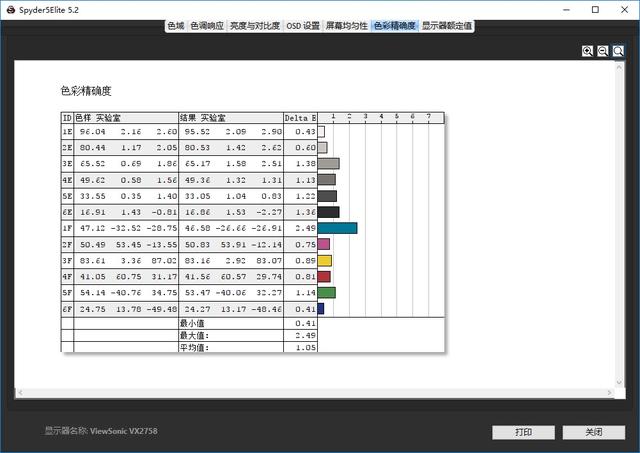 色彩精确最小值 0.41,最大值 2.49,平均值 1.05。