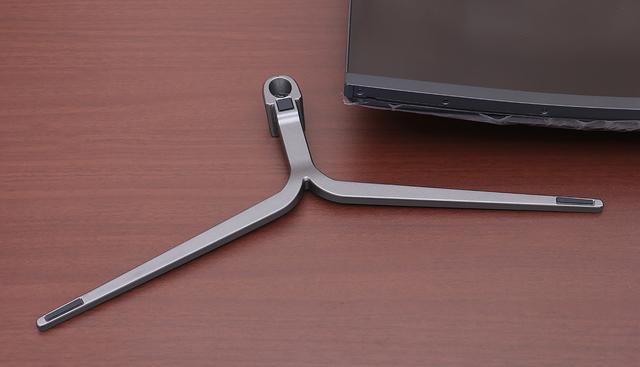 底座看上去很纤细,看着就觉得担心,不过它利用了三角形稳定结构,立在桌面上还是很稳的。值得一提的是,底座需要使用螺丝固定在显示器支架上,而安装螺丝竟然没有使用免工具设计,前前后后帮朋友装过几十台电脑,如此不人性化的设计还真是第一次遇到。