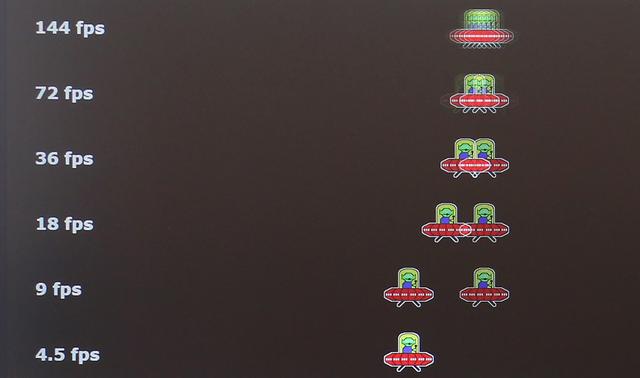 高刷新率的优势就是让游戏的画面更加连贯与流畅,减少错过画面细节,这对于第一人称射击这种画面变换快的游戏尤为重要,设置 1/30s 的快门速度,屏摄画面放大后可以看到 144Hz 下的 UFO 比起下面其它刷新率的更加连贯,而人眼看到的感觉就是移动的物体轨迹更加顺滑了。