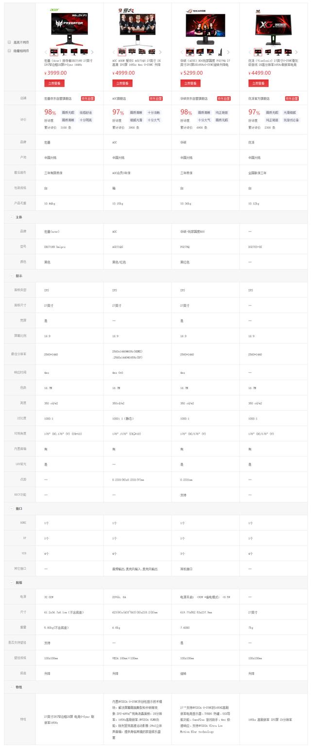 说起电竞显示器,相信大家会第一时间想到“四大金刚”,通过对比其实不难发现,这四款显示器无论是尺寸、分辨率、刷新率以及面板类型都完全一样。楼主认为,27寸 2K 分辨率对于日常办公娱乐而言的确是一个不错的组合,但对游戏而言,特别还需要在高刷新率下游戏,对电脑配置是一个不小的要求,在花大价钱购入这类高端电竞显示器之后,主机也需要一笔颇大的投入。