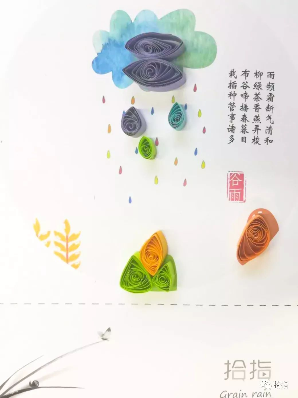 在谷雨这一天,各地都有不同的习俗,如禁杀五毒、走谷雨、喝谷雨茶、祭海、食香椿、赏谷雨花、祭仓颉等。而在新鲜胡同小学,学生们则亲手制作着二十四节气衍纸谷雨作品,将自己心中的谷雨时节,用衍纸的形式表现出来。学生们兴致勃勃,积极参与,在拾指老师的指导下,制作出精美“谷雨”衍纸作品,师生们愉快地度过了这春季的最后一个节气。