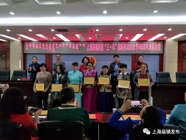 3月9日,上海庙镇召开庆祝“三八”国际劳动妇女节108周年表彰大会,会上表彰奖励了“三八红旗手”17名、“三八红旗集体”5个、“幸福家庭”14户、“好婆婆”“好媳妇”各14名、优秀妇联主席3名、巾帼致富带头人2名,集中展示新时期上海庙镇女性风采,弘扬先进典型,充分发挥先进的榜样作用,带动、引领、激励全镇妇女不断创新创业,在上海庙镇改革发展稳定大局中建功立业。