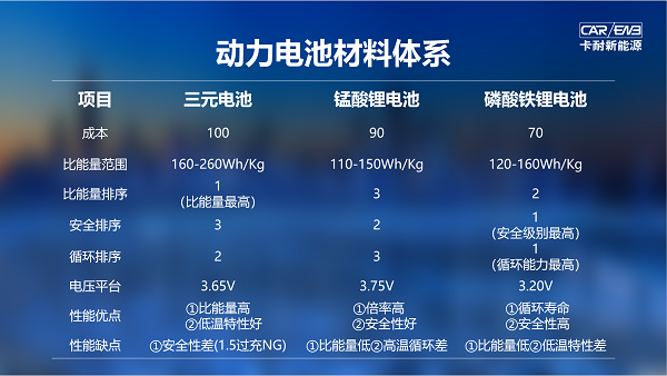 从比能量来说,三元是最高的,磷酸铁锂次之,锰酸锂差一些,成本上三元去年的统计,如果是100的话,磷酸铁锂是90,锰酸锂是70,现在国家要求是高比能量,所以现在所有的电池厂也好,整车厂也好都要求高比能量,但是一旦国家补贴消失以后,会不会还是这个局面,可能整个行业会重新洗牌,定义新能源车。