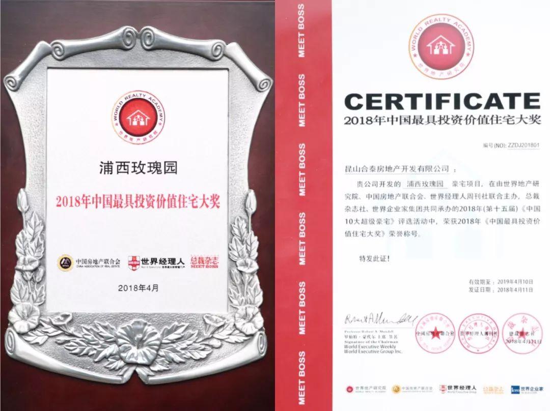 浦西*瑰园玫**荣获“2018年中国最具投资价值住宅大奖”