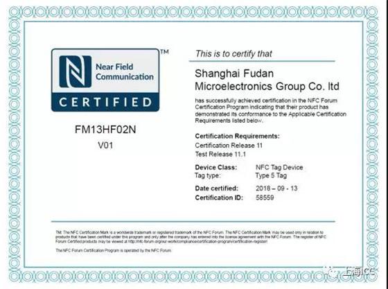 2018年9月13日上海复旦微电子集团股份有限公司FM13HF02N芯片正式通过了NFC Forum TAG(T5T)认证。这是国内首颗通过NFC Forum TAG认证的自主研发芯片。
