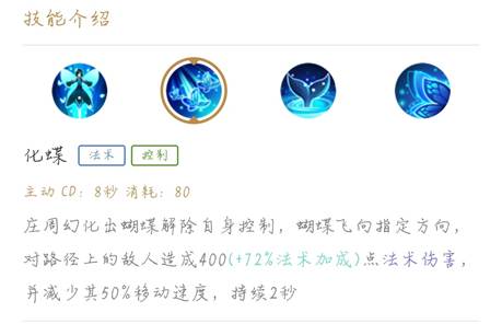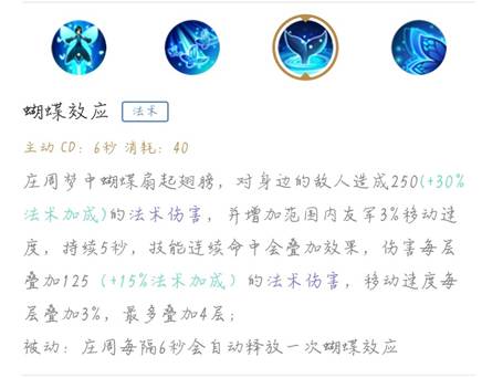 庄周的主要消耗技能,而且每六秒就会自动释放一次,在第一次加二技能时会自动释放一次,然后每隔六秒释放一次,而被动每隔六秒就进入免控状态(此时游戏中英雄会发生变化),可以根据这个进行第一次加点和计算自动释放蝴蝶效应的时间。