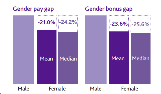 英国央行尽管努力支持无性别差异的公平薪酬,但如上图所示,不论从女性调查对象(时薪、红利)收入的中位数(median)还是平均数(mean)进行比较,男性在收入方面占绝对优势,女性在奖金方面的中位数比男性竟然能低25.6%,奖金平均数低于男性23.6%。