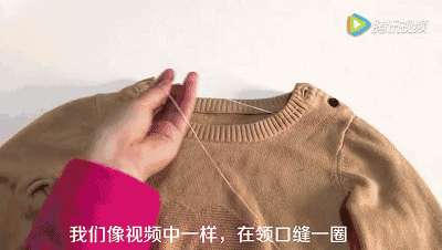 用针线在领口缝上一圈,不用担心会留下痕迹,针线比毛衣的织线细多啦~
