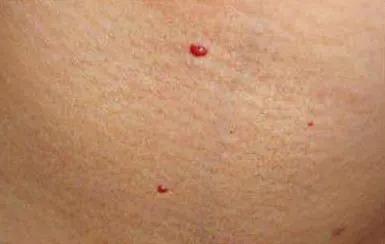 ❸血管痣:血管痣又称樱桃状血管瘤,大多高出皮面,是由于皮肤浅层毛细血管增生和小动脉持续扩张而造成的。按压后会退色,易破裂出血。