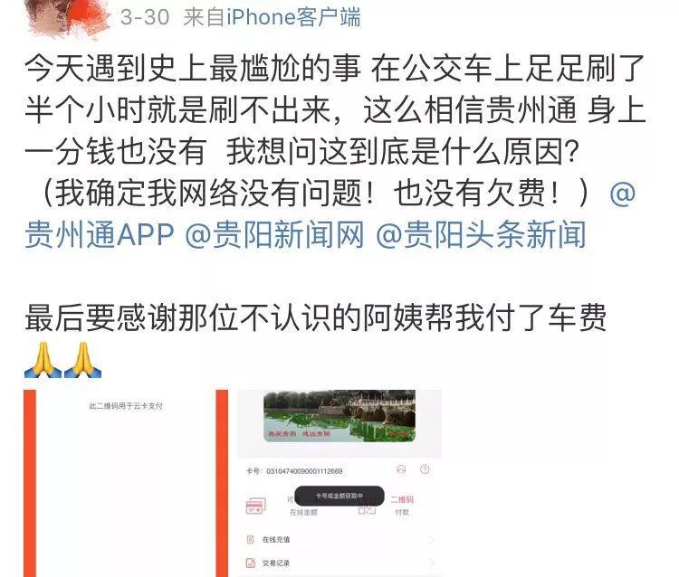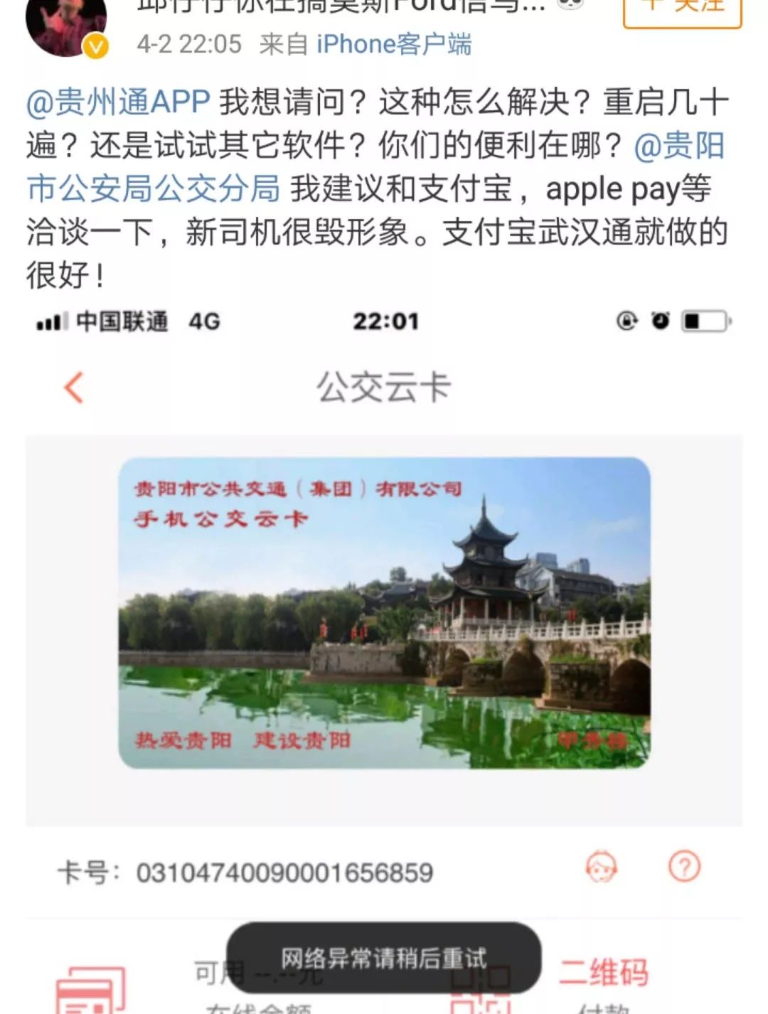 4月1日晚,微博网友发布微博称,在使用贵州通APP时,频频出现网络故障。