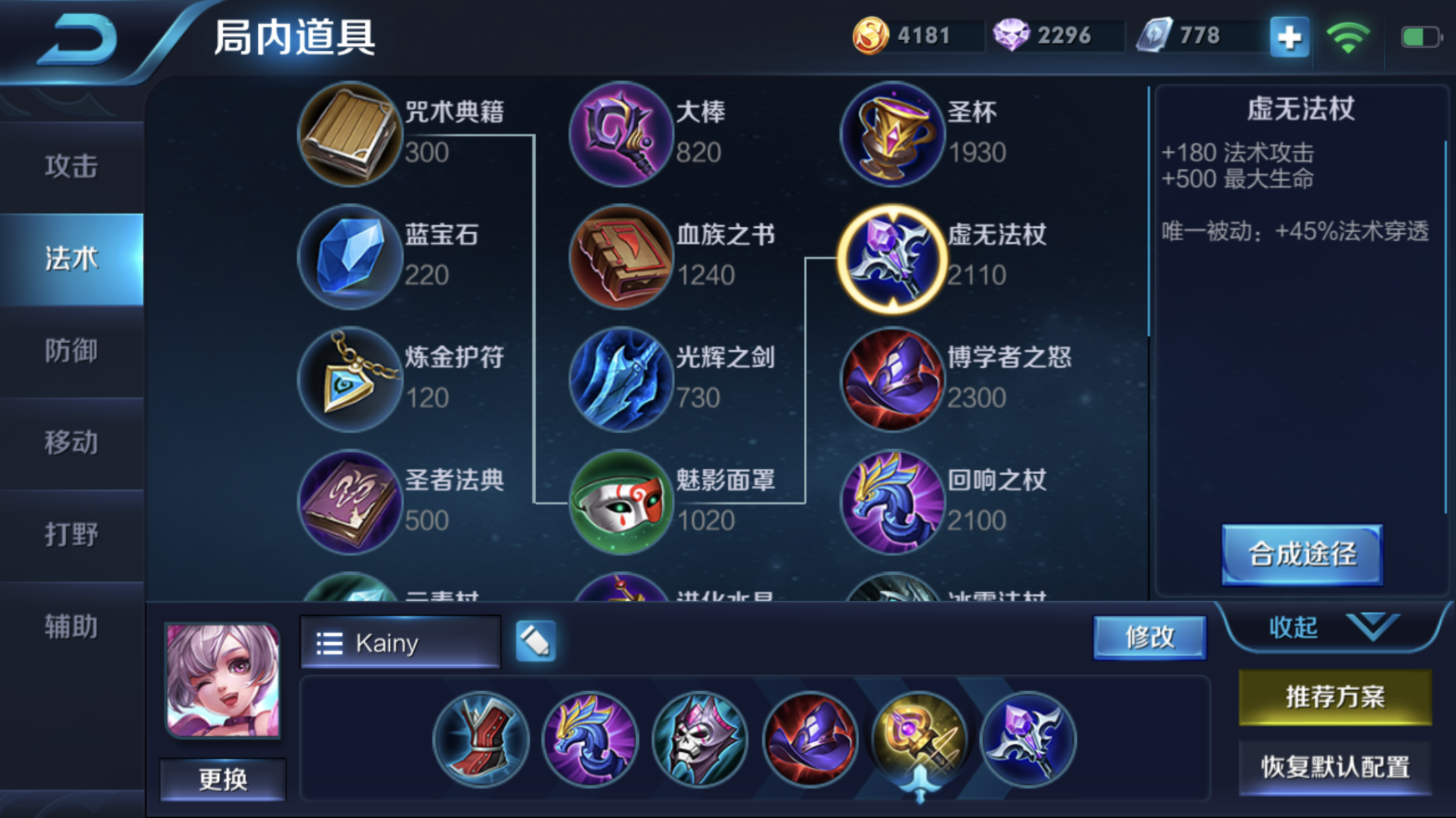 关于几件法强装的顺序,Kainy认为小乔应该回响,这样探草丛就会有爆炸效果,输出环境也变得更好,然后出一个小面具(魅影面罩),出完帽子后再合成大面具。