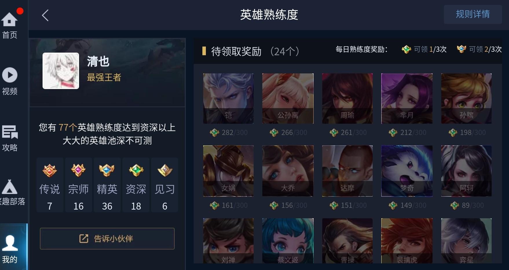 这个方法比较隐秘,但同样奖励丰富。一个英雄蓝色熟练度可以得到250铭文碎片,如果满英雄达到蓝色,83*250=20750铭文碎片,等同于送了将近十几个五级铭文。入口在首界面-英雄-定制攻略-所有英雄-我的英雄熟练度奖励,限制一天只能领取三个英雄蓝色绿色奖励,没有领取的小伙伴可以去看看,有惊喜哦。推荐指数:★★★★