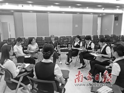 在汕头口腔医疗中心,每位患者到院、咨询、挂号、缴费、检查、换科室等所有环节,都有客服或护士引导。图为客服人员接受培训。受访者供图 |