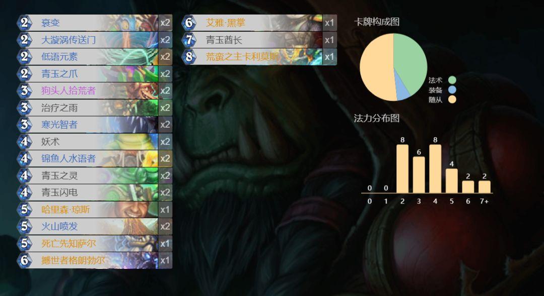 在几个版本之前,萨满曾是一个令许多人闻风丧胆的职业,与当时的控场战、手牌术共同统治者天梯,但随着前期核心牌图腾魔像退了环境,萨满卡组从此一蹶不振,而在猛犸年推出的几个扩展包也并未给予萨满合适的补强,导致萨满在短暂的辉煌之后又重归“隐藏职业”的尴尬境地。幸运的是,在本次削弱补丁上线之后,终于有玩家开发出了一套强度还算可以的青玉元素萨卡组,让我们来看看吧!