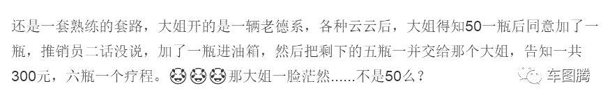 也有对新车做文章的。推销员遇到刚买不久的新车,更是会兜售这些添加剂,号称对磨合期有好处,以后车“巨整”。