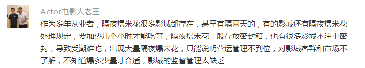 不少网友在评论里发表了自己的看法,比如,有人曝出隔夜爆米花是业内一直存在的现象,呼吁影城加强管理,“隔夜爆米花很多影城都存在,甚至有隔两天的,有的影城还有隔夜爆米花处理规定,要加热几个小时才能吃等,隔夜爆米花一般存放密封箱,也有很多影城不注重密封,导致受潮难吃,出现大量隔夜爆米花,只能说明营运管理不到位,对影城客群和市场不了解,不知道爆多少量才合适,影城的监督管理太缺乏”。