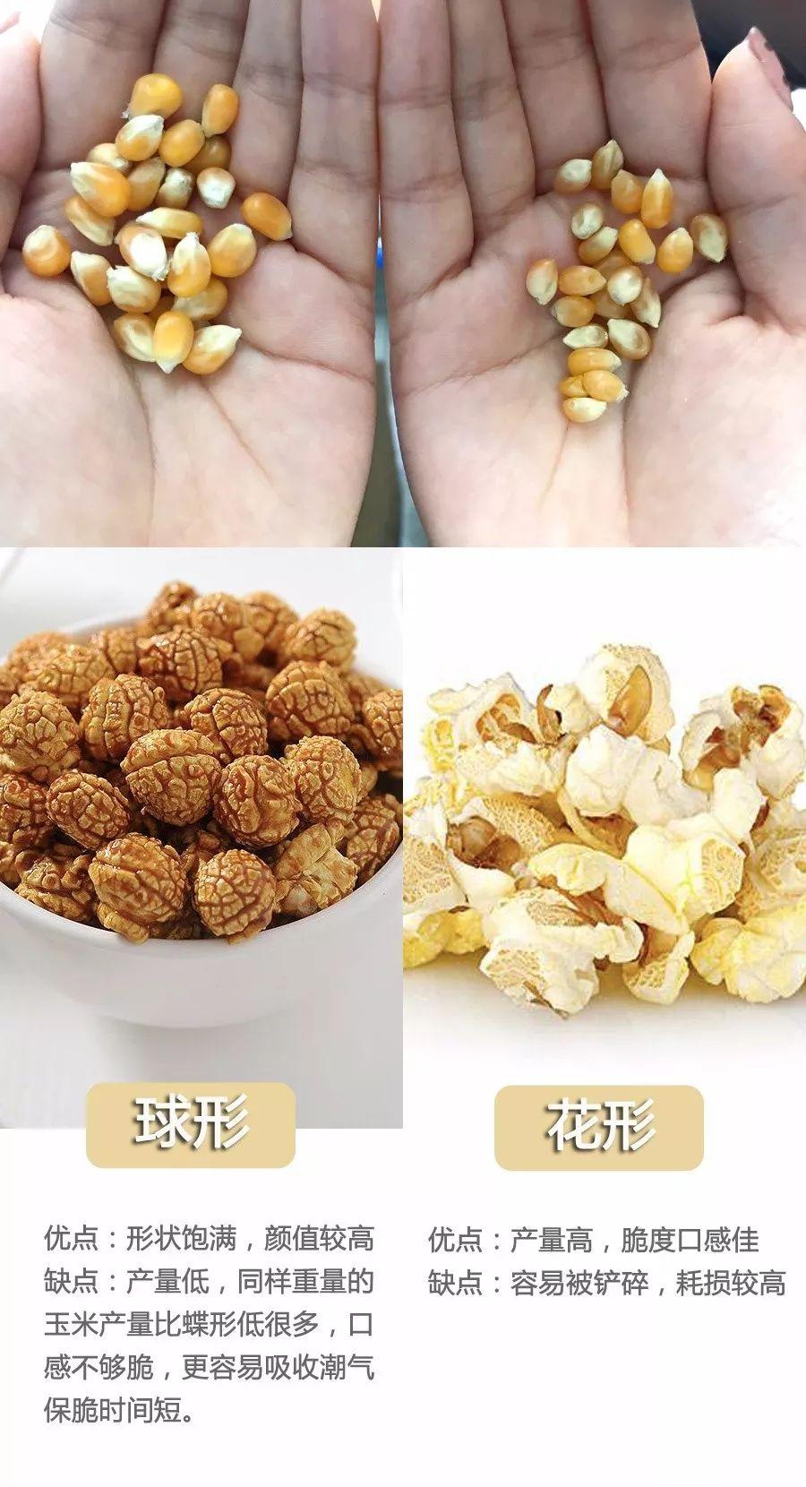 球形与花形采用的爆裂玉米种类不同,在产量、外形、口感上也各有优缺点,一起来看一看: