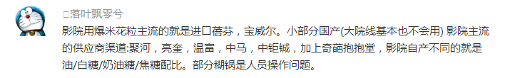还有人向小电君介绍了,业内爆米花供应渠道,“爆米花粒主流的就是进口蓓芬,宝威尔。小部分国产(大院线基本也不会用) 影院主流的供应商渠道:聚河,亮奎,温富,中马,中钜铖,加上奇葩抱抱堂,影院自产不同的就是油/白糖/奶油糖/焦糖配比”,并指出部分糊锅是人员操作问题。
