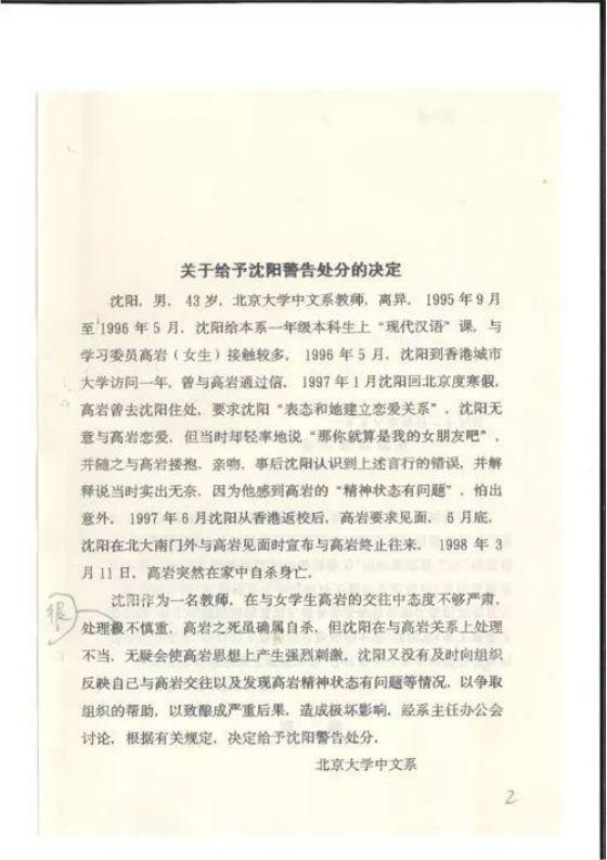 对此,北京大学官方微博今天发布最新回应,校方出具当年《关于给予沈阳行政警告处分的决定》。文件显示,该校认定,沈阳1995年9月至1996年5月,沈阳给中文系本科生上“现代汉语”课,与学习委员高岩接触较多。1996年5月,沈阳到香港城市大学访问期间,曾与高岩数次通信。1997年1月,沈阳回北京度假,高岩去沈阳住处,要沈阳“表态和她建立恋爱关系”,沈阳无意与高岩恋爱,但当时却回答说“那你就算是我的女朋友吧”,并与高岩搂抱、亲吻。