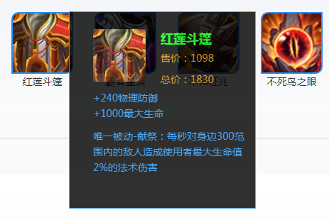 红莲这件装备其实放到另外一种出装套路里也成立,它对扁鹊的作用也是提高生存能力,并且还能提供一定的输出。扁鹊的生命值成长是每级230点,那么一个10级的扁鹊就拥有5300左右的生命值,红莲的被动效果每秒造成5300*2%=106点魔法伤害,几乎跟叠满5层的初级毒印记伤害相同,在面对某些突脸的近战时,红莲可以让扁鹊的被动更有威慑力,并且提高了一定的抗击打能力。