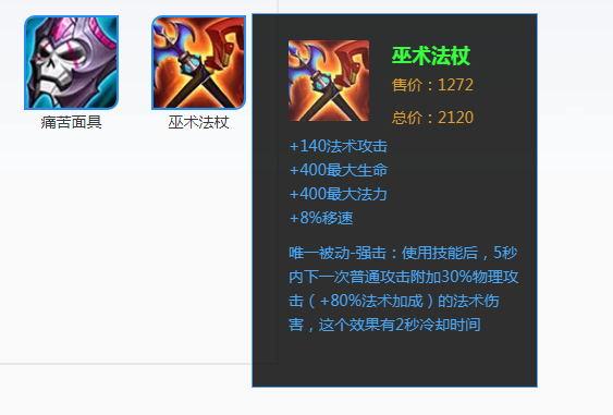 【巫术法杖】这件装备拥有所有法师装备里最高的移速加成,可以为扁鹊提供350*0.08=28点移动速度,而草鞋的移速是30,所以这件装备的性价比很高,并且每次释放技能之后平A附带一个168*0.3+140*0.8=162点魔法伤害(不考虑其他装备或铭文加成),跟4级的2技能伤害量相同,最重要的是这个效果的冷却是2秒钟,刚好和1技能的释放间隔一样,所以掌握好节奏每次释放1技能后接平a,都可以触发巫术法杖的被动效果,提高扁鹊的输出效率。因此勇武流的扁鹊,第一个大件做巫术法杖是毋庸置疑的。