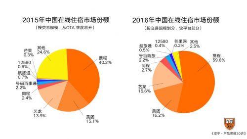 就在携程一统天下的时候,美团的份额从2015年的15.1%到2016年的16.2%,份额并没有下降,也在用自己的速度增长。美团也在2016年打胜了外卖这个大仗,整体流量又进一步。新用户的进入,让美团酒店也受益了。