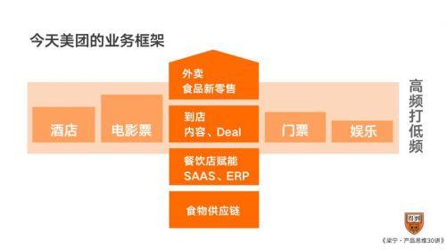 外卖作为头部是极其高频的,美团最极致的用户一个月会点二十几次外卖。有这样高频的业务带动,就可以形成流量分发,分发到电影票、酒店、门票、娱乐这些领域。