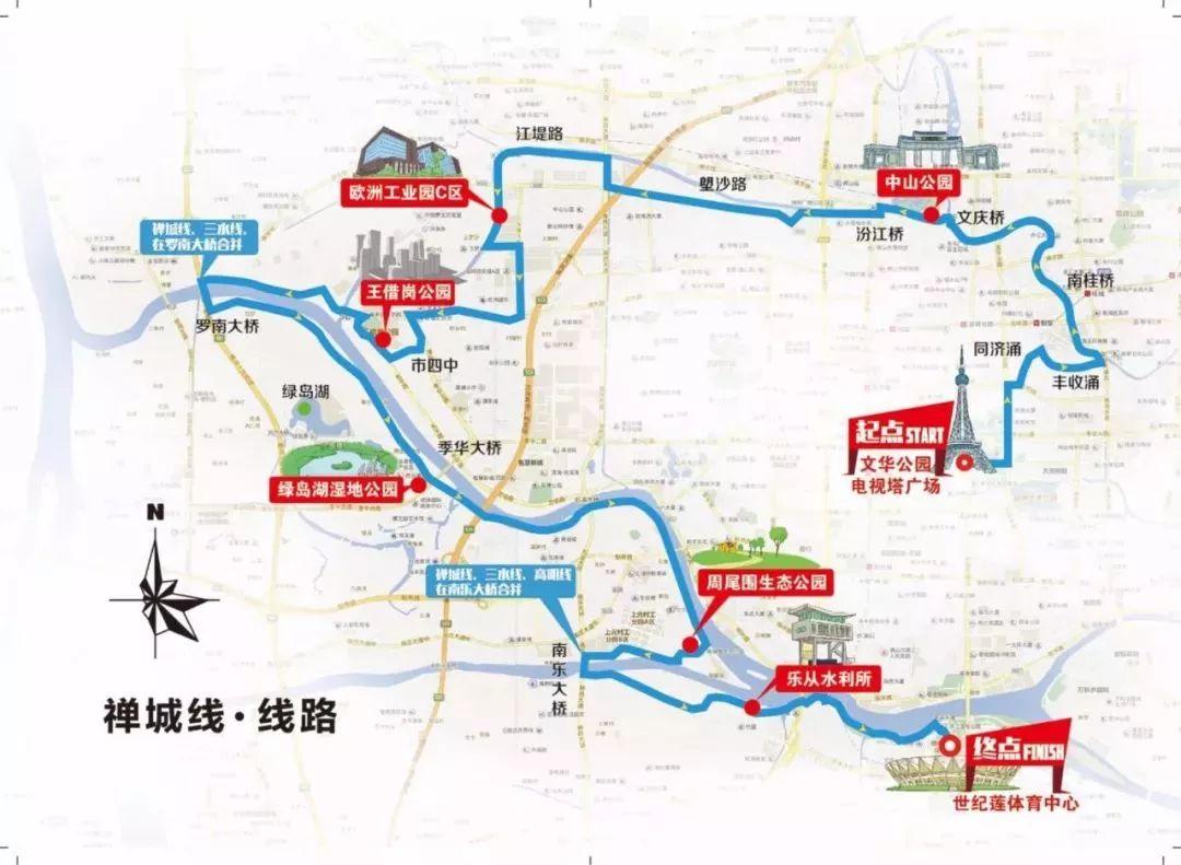 南海线路线:千灯湖活水公园(起点)——南海体育公园——映月湖公园——东平社区公园——半月岛湿地公园——佛陈桥底——华阳桥——世纪莲体育中心(终点)